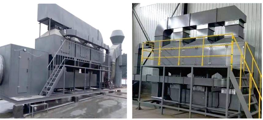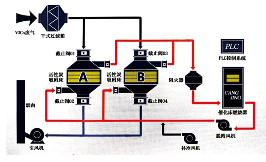 The adsorption device is equipped with one set of standby adsorption tank. When the activated carbon is saturated with adsorption, it is switched to the catalytic combustion desorption state through a control valve. The desorption and regeneration system adopts on-line desorption and regeneration, and can also adopt off-line desorption and regeneration. That is, the adsorption process is a continuous treatment process. While the standby adsorption device is put into use, the saturated adsorption tank performs desorption work. After desorption, the activated carbon tank is ready for the next cycle of use.