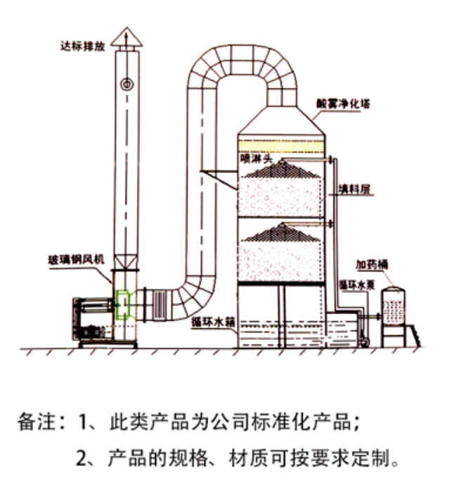 The gas inside the water spray absorption tower is sent in by a fan and flows from bottom to top. The absorption liquid is pumped into the top of the tower by an acid-resistant pump and evenly sprayed downward through the liquid distribution device, forming countercurrent absorption. After the neutralized gas passes through the demisting device inside the tower, it is discharged into the atmosphere through the chimney.