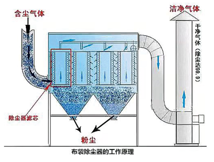 The working principle of a baghouse dust collector consists of a filtration process and a dust cleaning process. Inside each filter bag, there is a cylindrical supporting cage. The dust-laden gas flows from the outside to the inside of the filter bag. Therefore, dust is filtered and collected on the outer surface of the filter bag, while the clean gas passes through the inner side and is discharged from the upper part.